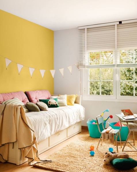 -Amarillo suave: Puede optarse por pintar toda la habitación o, en un tono apenas más oscuro, una sola pared. Si bien tiempo atrás solía asociarse con la ansiedad, lo cierto es que este tono suave brinda calidez y luminosidad al espacio, lo cual fomenta la creatividad e imaginación.