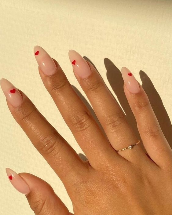 Los diseños minimalistas son otra gran posibilidad para quienes prefieran algo menos llamativo. Bases neutras o transparentes con pequeños diseños en color rojo, son una buena alternativa. En este caso, los corazones hacen juego con la romántica fecha que se aproxima.