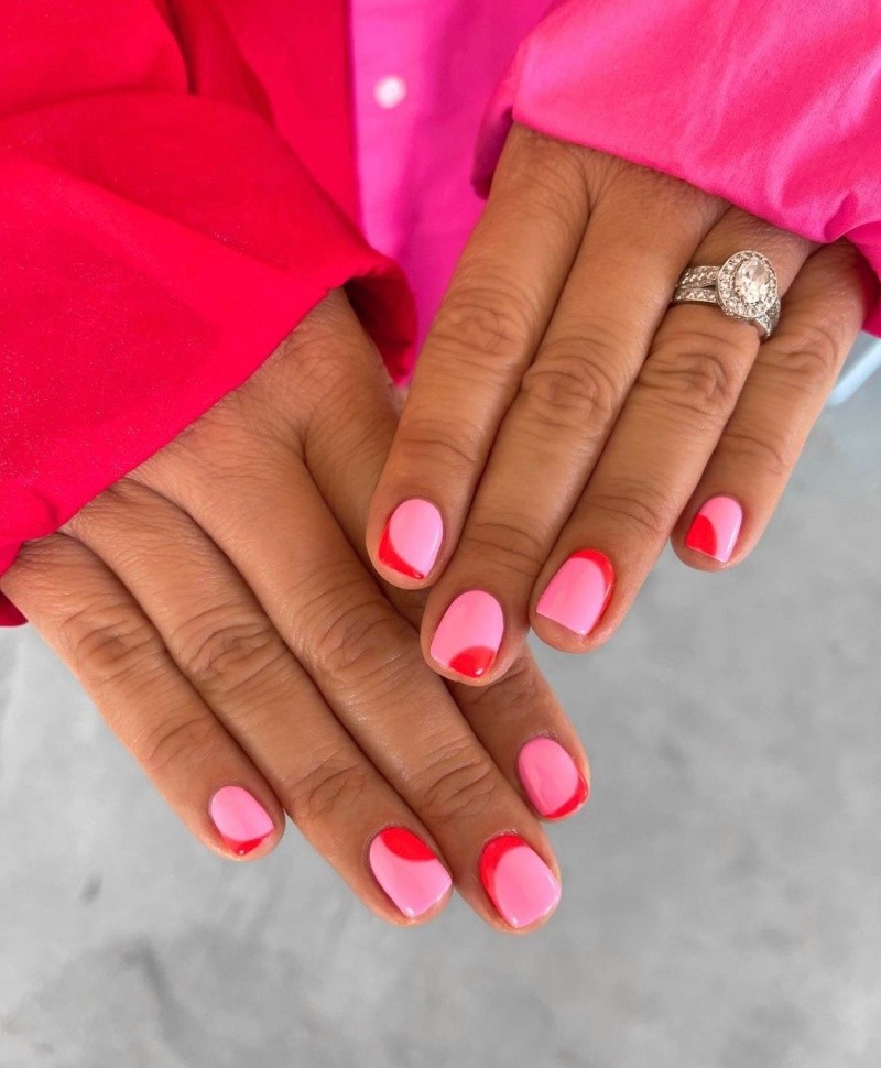 Jugar con distintos diseños a través de dos tonalidades, es otra opción para quienes no se animen a un rojo completo. En este caso, en combinación con rosa y algunos pequeños detalles en rojo que no necesariamente lucen iguales en cada uña. ¡A jugar con la creatividad!