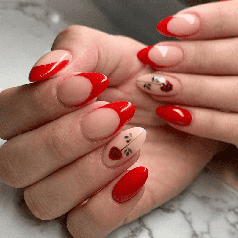 Ideales para lucir en una fecha tan especial como San Valentín. Las rosas son un símbolo clásico del romanticismo y un buen diseño que las tenga como protagonistas, hará que las uñas se vean perfectas. En este caso, distintas técnicas que combinen el rojo en 4 uñas y un dibujo de rosa en la uña restante.
