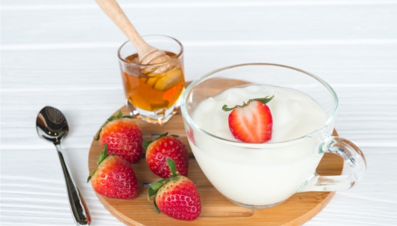 Ingredientes: 2 cucharadas de miel de abeja orgánica, media taza de frutillas desinfectadas, 2 cucharadas de yogurt natural sin azúcar.