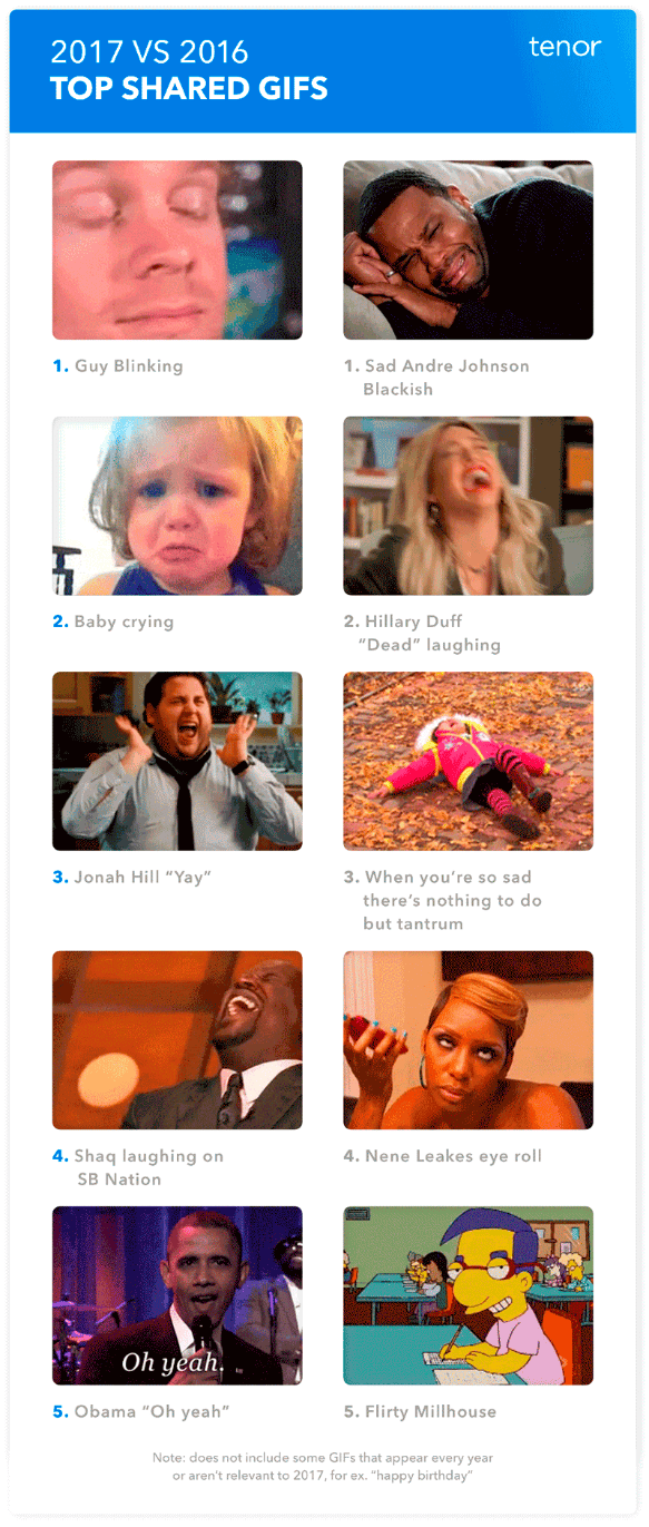 Por su parte, Tenor (integrado con Whatsapp, Twitter, iMessage, Facebook y otros servicios) elaboró un reporte propio sobre los GIF más utilizados por internet en 2017, con resultados diferentes:
