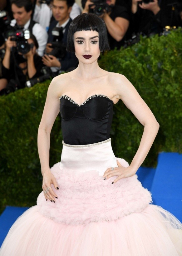 Lily Collins lució una peluca morena, muy muy oscura, corte bob y flequillo muy corto que no la favorece nada y que acentúa más su palidez. Definitivamente no es su mejor look.