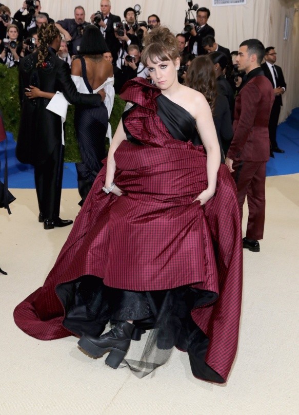 Demasiado pomposa. Lena Dunham ha escogido un un diseño de estampado de cuadros granates y escote asimétrico con maxi lazo muy poco favorecedor de Elizabeth Kennedy.