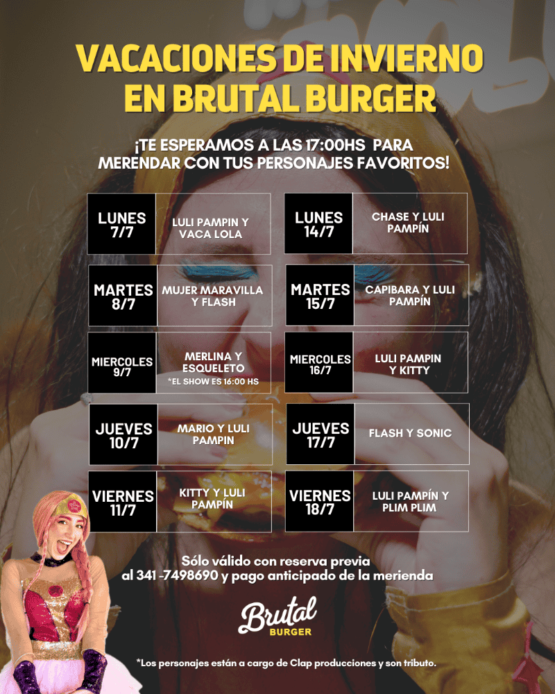 El próximo lunes 7 de julio comienzan a celebrarse las vacaciones de invierno, dos semanas de completo receso escolar en pos de descansar y relajarse a mitad de año. Para acompañar las tardes, de lunes a viernes desde las 17 y durante ambas semanas, el local rosarino Brutal Burger suma por tercer año consecutivo sus exitosas meriendas con shows junto a los personajes preferidos de las y los más pequeños.