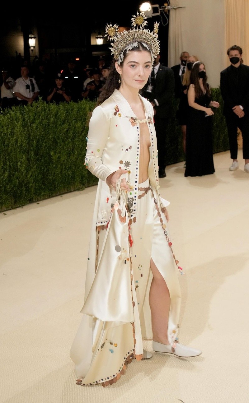 Lorde eligió un outfit con alusión a lo religioso, incluyendo una corona, a través de una nueva firma en el mundo de la moda, Bode. (papermag.com)