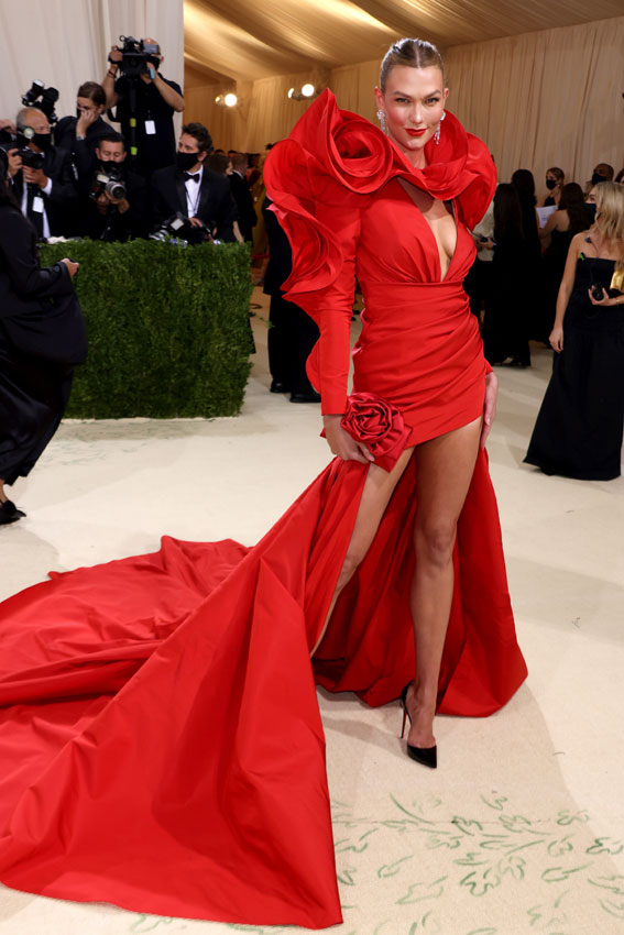 Kaia Gerber lució un elegantísimo vestido negro con detalles de flores y falda estructurada de Oscar de la Renta. El diseño está inspirado en un Haltson que vistió Bianca Jagger en la Gala MET de 1981 (vogue.com)