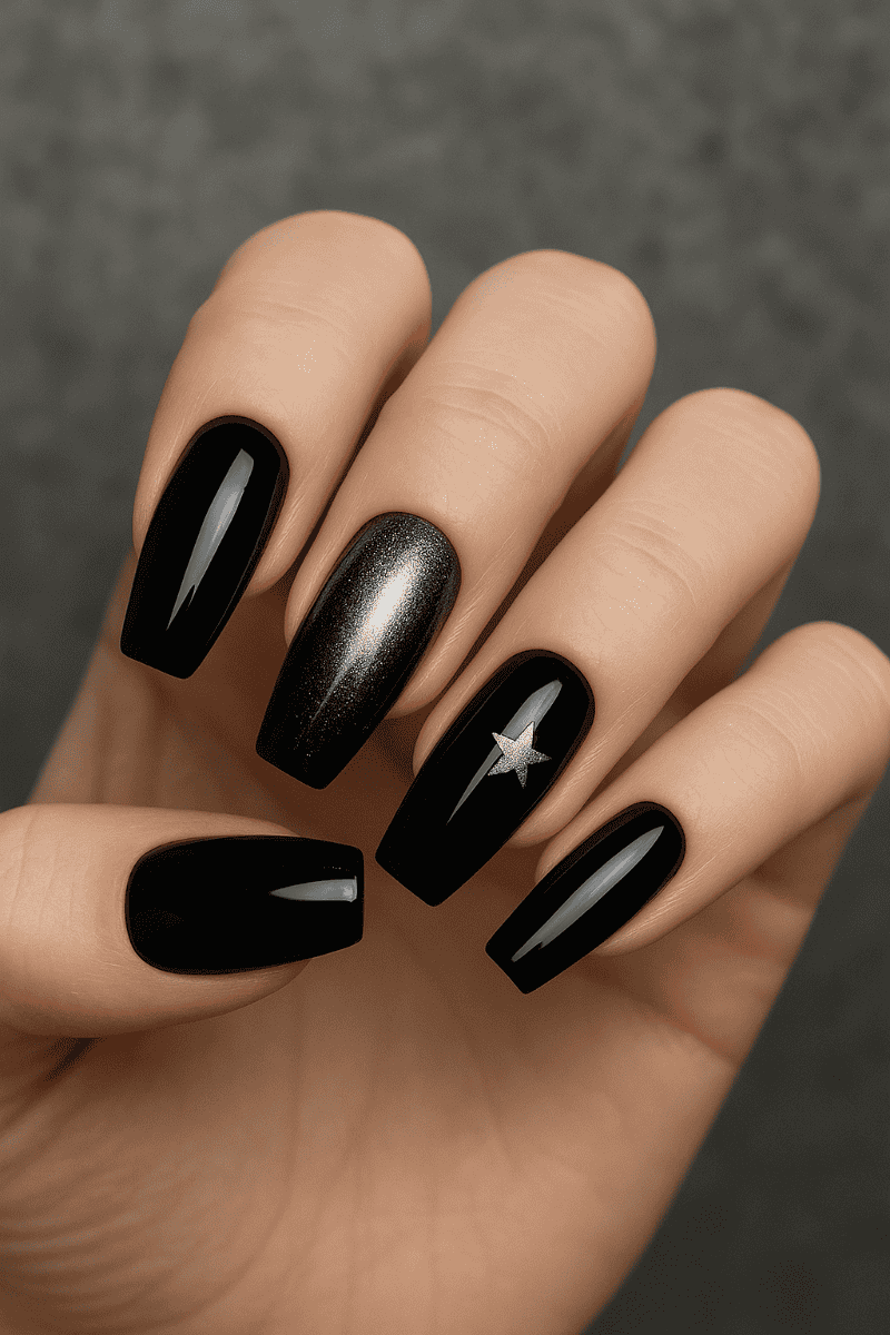 -“Goth glam” con brillo metálico: El negro sigue siendo el color insignia de Halloween, pero este año se combina con acabados metálicos o cromados. Uñas negras con reflejos en plata o violeta dan un toque sofisticado al look sin perder el espíritu dark. Ideal para quienes prefieren algo sobrio, pero con actitud.