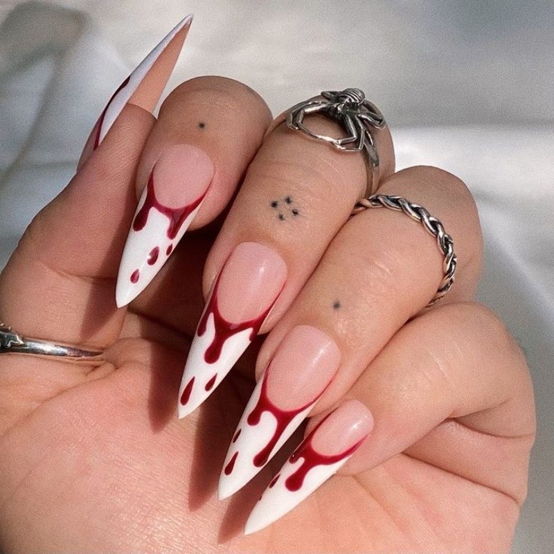 -“Bloody tips”, las francesitas sangrientas: La clásica manicura francesa se reinventa con puntas rojas que simulan gotas de sangre. Algunas nail artists suman efectos 3D con gel o mini ilustraciones de colmillos. Es una de las tendencias más virales en TikTok y perfecta para un disfraz minimalista pero efectivo.