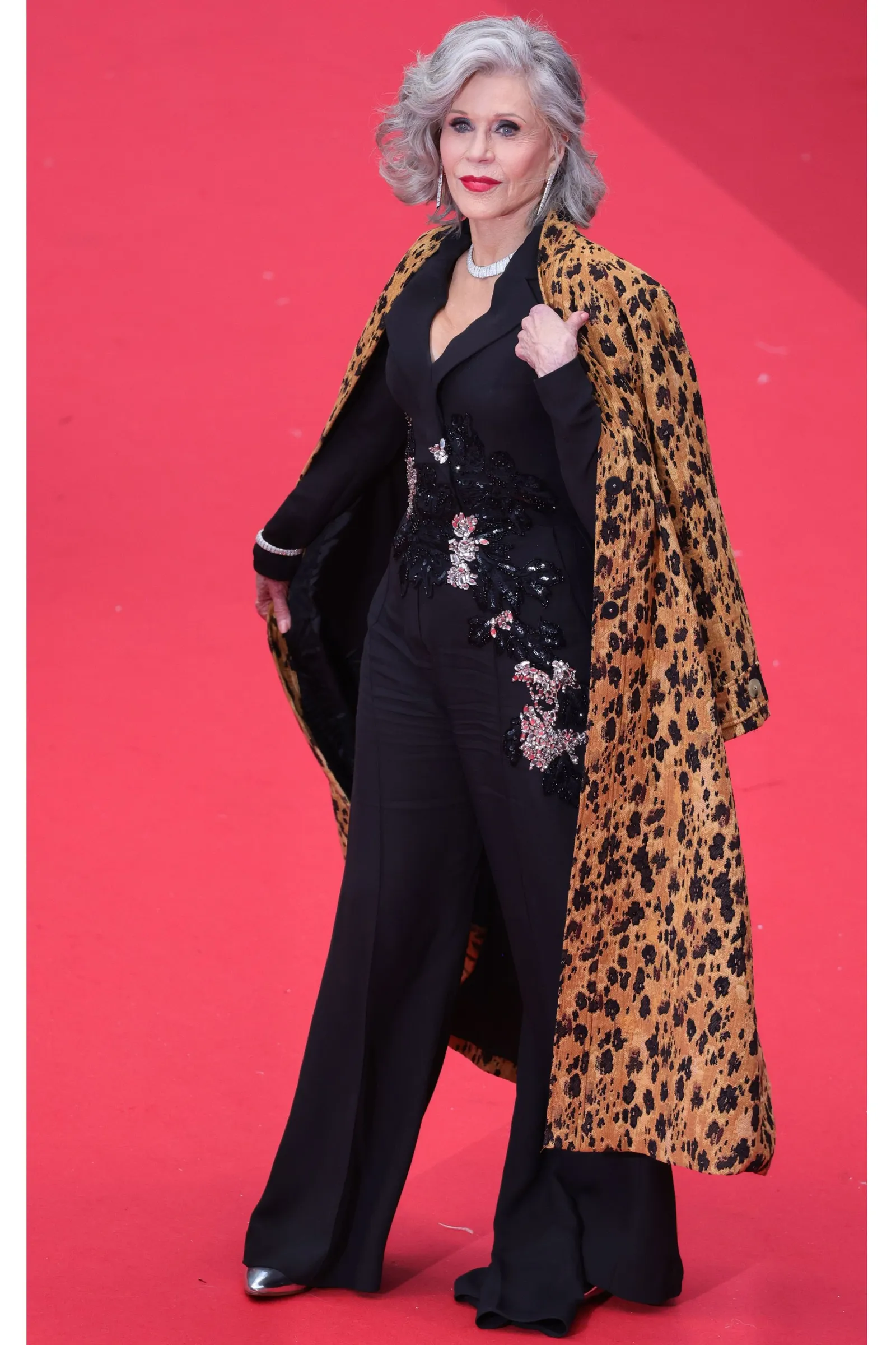 Una de las grandes personalidades que se robó todas las miradas fue Jane Fonda, quien fiel a su estilo sofisticado pisó firme la alfombra y deslumbró con su make up a lo mob wife. Esta tendencia, que tuvo gran auge la temporada pasada, hace alusión a la estética new rich junto a llamativos outfits que la acompañan. En este caso, la actriz y embajadora de L'Oréal hizo match con un elegante traje en negro junto a un tapado animal print.