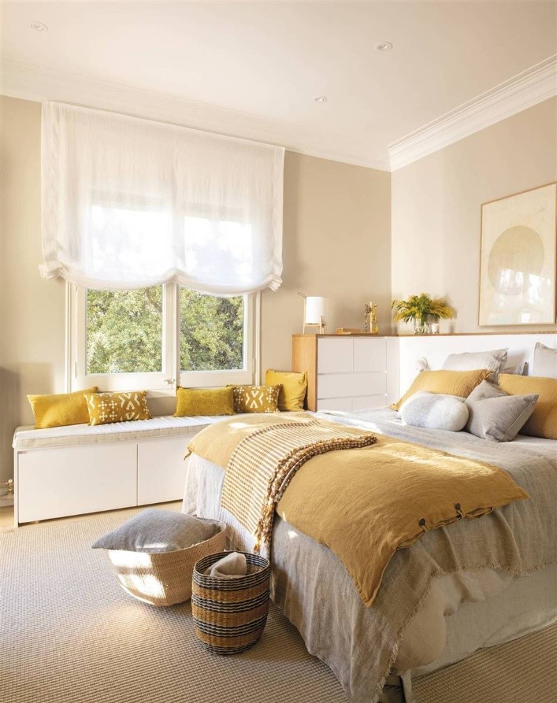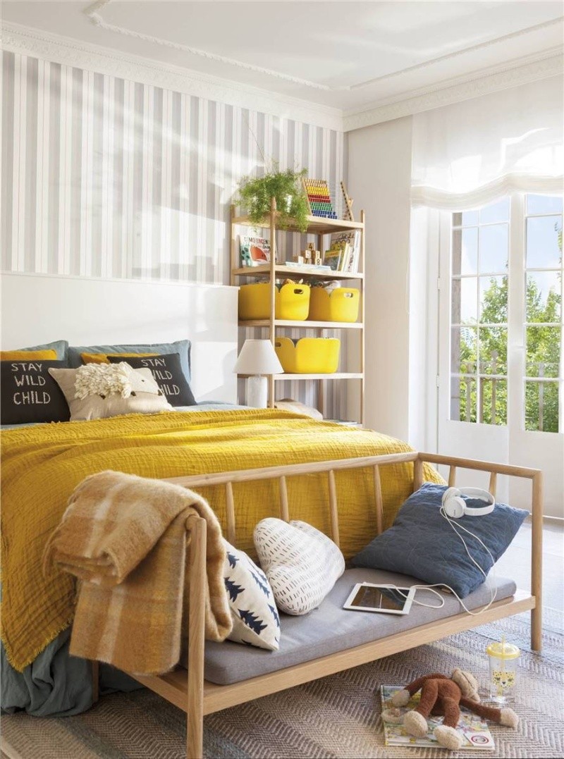 El gris es el mejor amigo del mostaza, ya que es el tono neutro que ayuda más a resaltar la calidez de su compañero. Uno de los elementos en donde más se luce esta combinación es en un pie de cama, llevando un buen clima a la habitación.