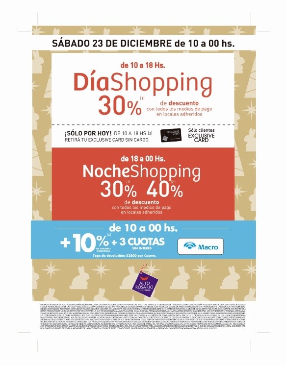 Continuando con la misma dinámica del año pasado, los clientes Exclusive Card accederán desde las 10Hs. a descuentos del 30% con todos los medios de pago. De 10 a 18Hs. se podrá retirar sin cargo la tarjeta de beneficios Exclusive Card por el Stand especial y acceder a todos los descuentos. Mientras que desde las 18Hs. todos los clientes de Alto Rosario accederán a descuentos del 30% y 40% con todos los medios de pago. La promoción cuenta con más de 100 locales adheridos. Además, durante todo el día, los clientes de banco MACRO tendrán un 10% de reintegro adicional con tarjetas de crédito y hasta 3 cuotas sin interés.