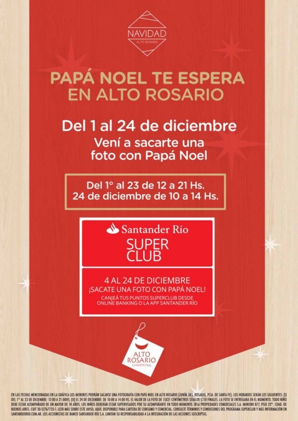 Para que nadie se quede afuera, del miércoles 20 hasta el viernes 22 de diciembre Alto Rosario Shopping extiende sus horarios de 10 a 23Hs. En cuanto al domingo 24/12 y 31/12 abrirá sus puertas de 10 a 17hs.