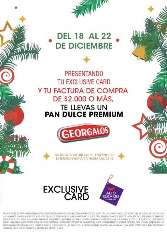 Además, desde el lunes 18 de diciembre y hasta el viernes 22 de diciembre, Georgalos ofrece una nueva promoción para los clientes, quienes presentando la tarjeta Exclusive Card y una factura de compra de $2.000 o más, se podrán llevar de regalo un Pan Dulce Premium para disfrutar en familia.