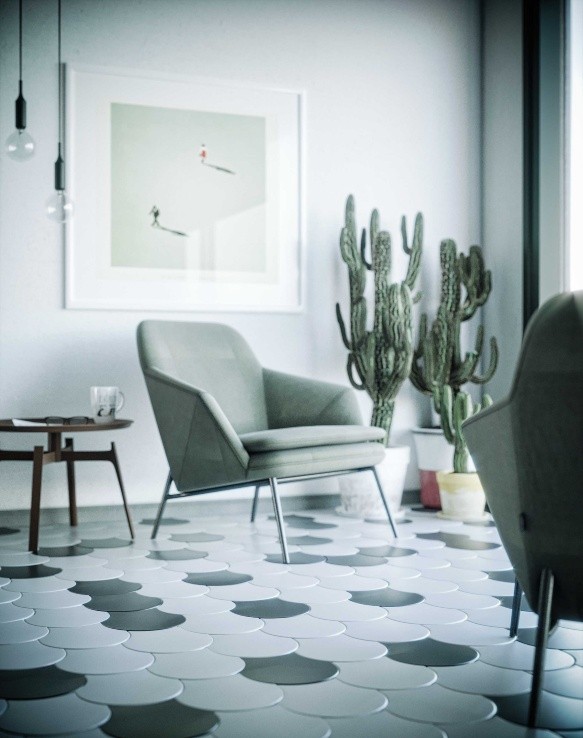 Otra de las tendencias son los pisos que delimitan espacios a partir del peso visual. Se imprime personalidad a los pisos mientras que en paredes y muebles se usa algo más neutro. Los pisos calcáreos están entre los más usados, se trata de un material artesanal con el que se puede variar el dibujo y color; también pueden colocarse mosaico granítico o terrazo. Los dibujos de tendencia son los geométricos como zigzag y rayas, en variantes de los blancos, negros y grises, que aportan modernidad.