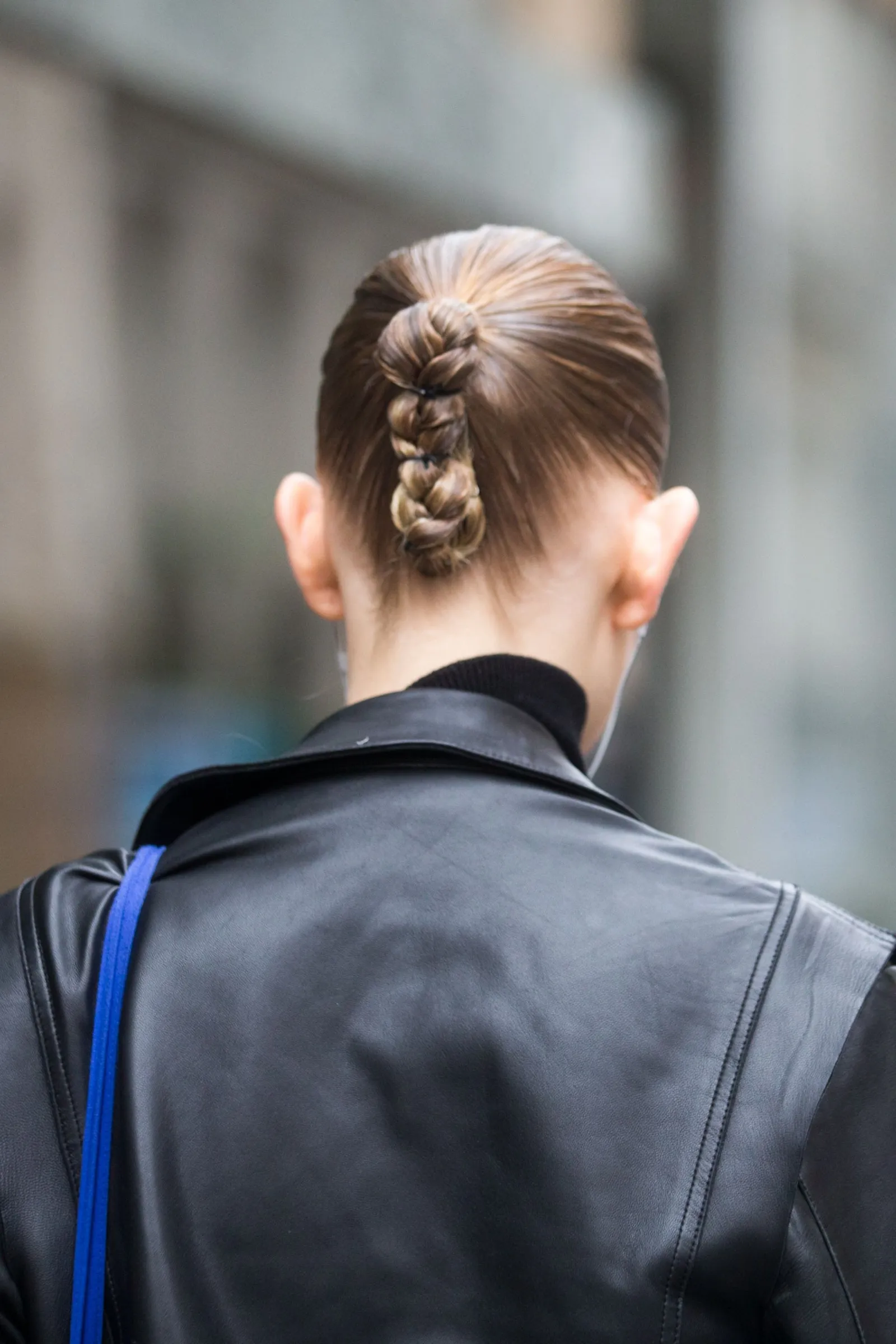 -Cola trenzada: Cepillar el cabello hacia atrás y atarlo con una cola alta. Luego, hacer una trenza con tres mechones y recogerla en un rodete usando colitas más finas.