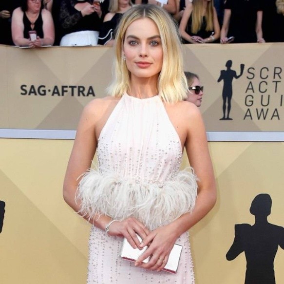1- Escotes halter y péplum de plumas por Margot Robbie