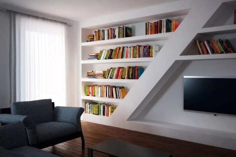 - Estantes de placas de yeso: Colocarlos de piso a techo amurados a la pared, genera un lindo espacio para colocar CD's musicales y, a su vez, por el material, se absorbe el sonido reduciéndose el ruido.