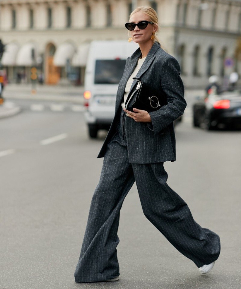 Un clásico conjunto de blazer y pantalón puede ser un atuendo ideal para usar sneakers. Un look apto tanto para ir a trabajar como para salir a cenar.