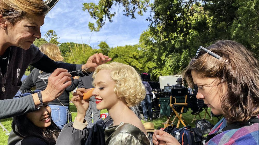 Williams, directora de maquillaje, supo contar en una entrevista para Netflix que todos debían estar bronceados debido a los filtros de color y, así, lograr el contraste perfecto con el maquillaje. Ocho colores de diferentes tonos rondaban entre el melocotón y el rojo intenso. Por otra parte, el cabello de Marion que era demasiado platinado, debió contar con oscuridad en sus raíces para poder brindar profundidad y transparencia. Se usaron alrededor de 100 pelucas.