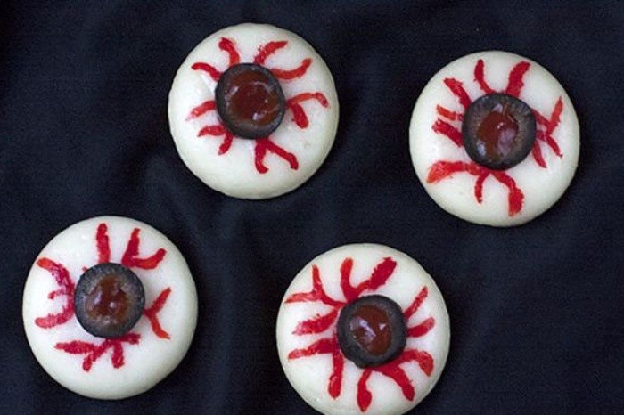 -Preparación: Con ayuda del pincel, dibujar las venitas de los ojos en los quesos utilizando colorante rojo. Mientras se seca, aprovechar a cortar las aceitunas negras en rodajas.