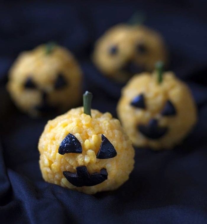 Con las manos aceitadas, formar bolitas con el arroz. Luego, pegar ojos y boca. Colocar por encima un trocito de pimiento verde para hacer la forma del tallo de las calabazas.