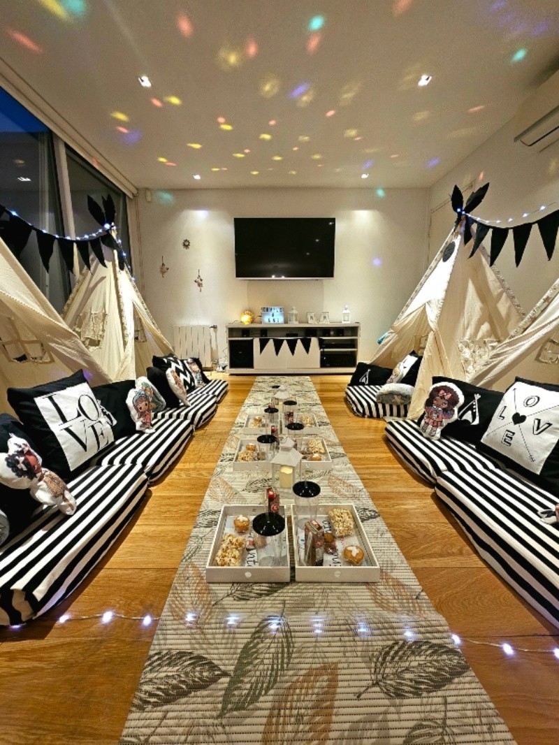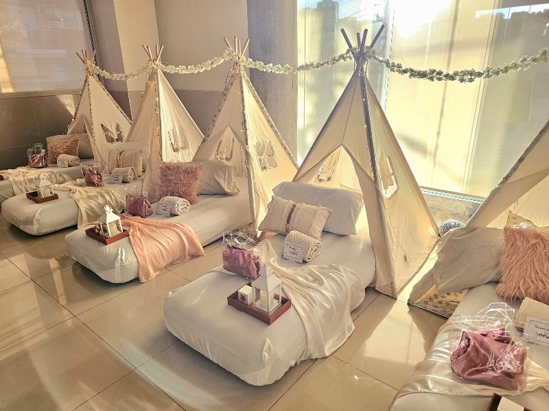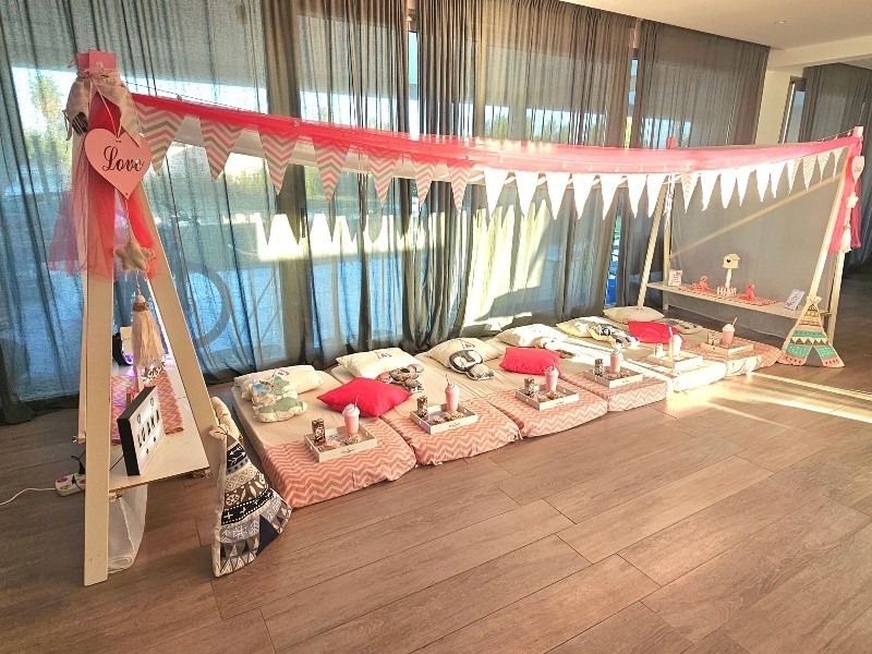 Encanto Pijamadas cuenta con diversos servicios que reúnen los conocimientos de ambas hermanas: la coordinación de eventos y el diseño gráfico. “Cuando arrancamos lo hicimos con 6 carpas estilo tippi, de lienzo, que cubrían hasta 12 niños. Actualmente contamos con lo necesario para que asistan hasta 18 invitados. Trabajamos con colchones tipo cuneros, de 10cm de altura por 130cm de largo; decoración con almohadas, globos, banderines, además de bandejas de desayuno con todo lo necesario para cada una”, profundizó Moni.