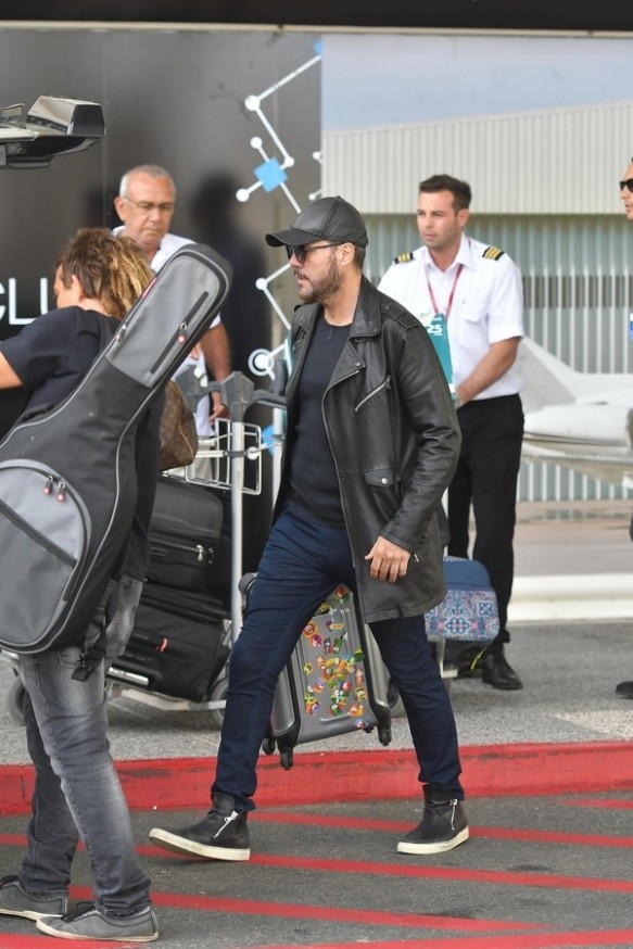 El productor arribó a la ciudad esteña con un un look casual y relajado: trench y cap de cuero negro, combinado con remera básica también negra, jeans azul oscuro y zapatillas con cierre.