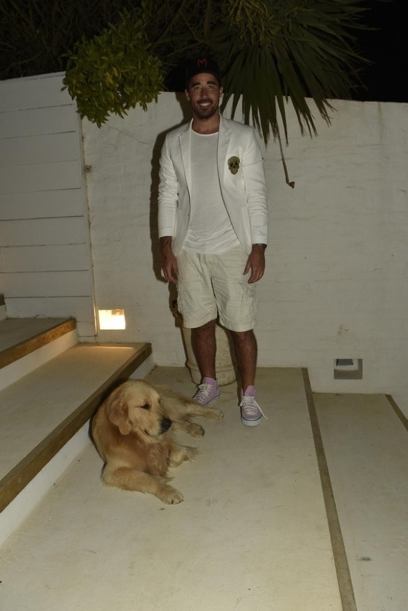 Para disfrutar la noche con sus amigos, Nacho optó por un blazer blanco con solapa de raso y el detalle bordado de una calavera en el bolsillo. Por debajo, una remera básica blanca de escote redondo y bermudas con bolsillos XL en beige. Accesorio estrella de la noche: cap negra con inscripción.