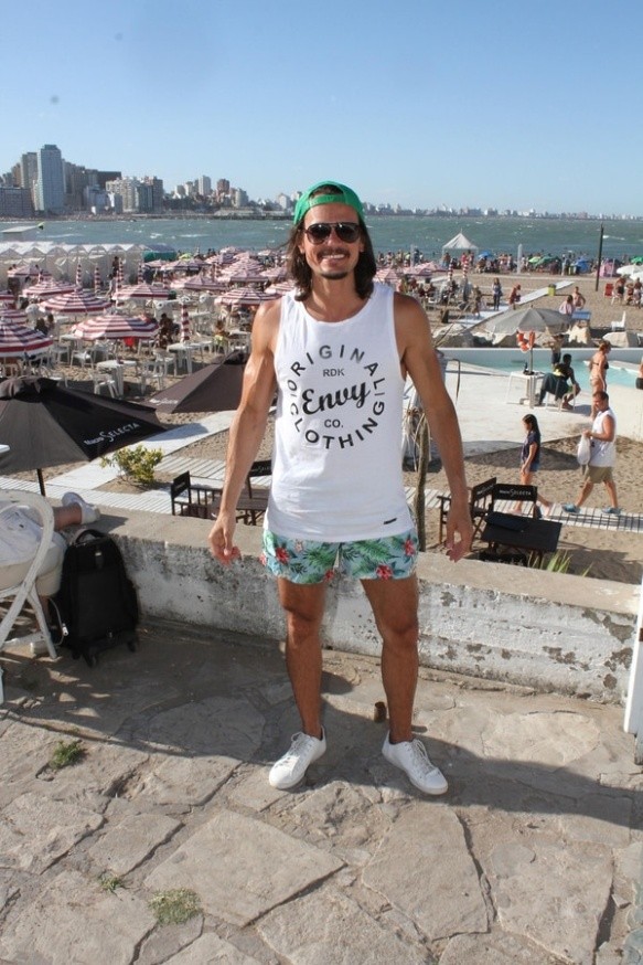 El modelo pasa su verano en Mar del Plata y elige para los días de calor y playa las musculosas con inscripciones y trajes de baño estampados con flores. Lo combina con cap verde, anteojos aviadores negros y zapatillas de lona blanca.
