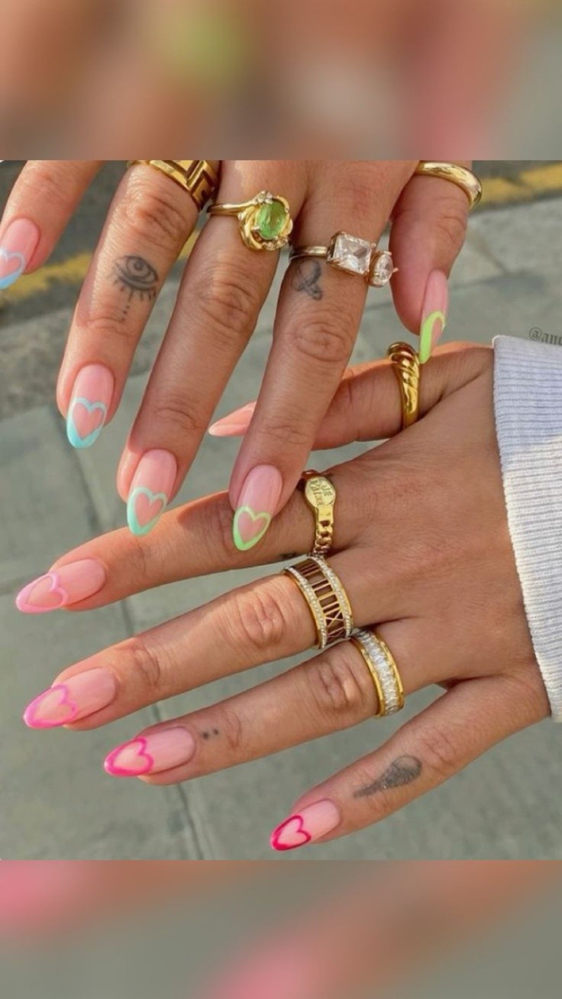 -Corazones flotantes y neón sutil: Desde revistas especializadas señalan que los corazones delicados nunca pasan de moda, pero ahora se renuevan con un twist veraniego. Así, tonos neón suaves sobre bases transparentes o pastel marcan un buen camino. La idea es que el corazón se vea como si estuviera “flotando” sobre la uña, ideal para las noches cálidas de verano. Estos diseños funcionan tanto en formas bajas y cuadradas como en almendradas y largas, dando un aire fresco y jovial.