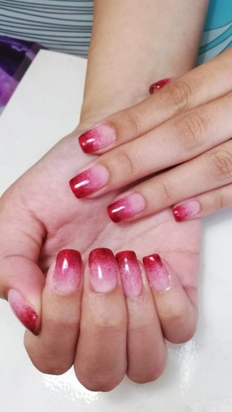 -Glitter degradado en rojo pasión: Si se busca un toque de glamour con actitud, el degradado de glitter va a convertirse en la opción favorita. Los portales de nail art avalados destacan que el efecto ombré de brillo desde la base hacia la punta (mezclando dorado, rosado y toques de rojo) da una vibra festiva y sensual.